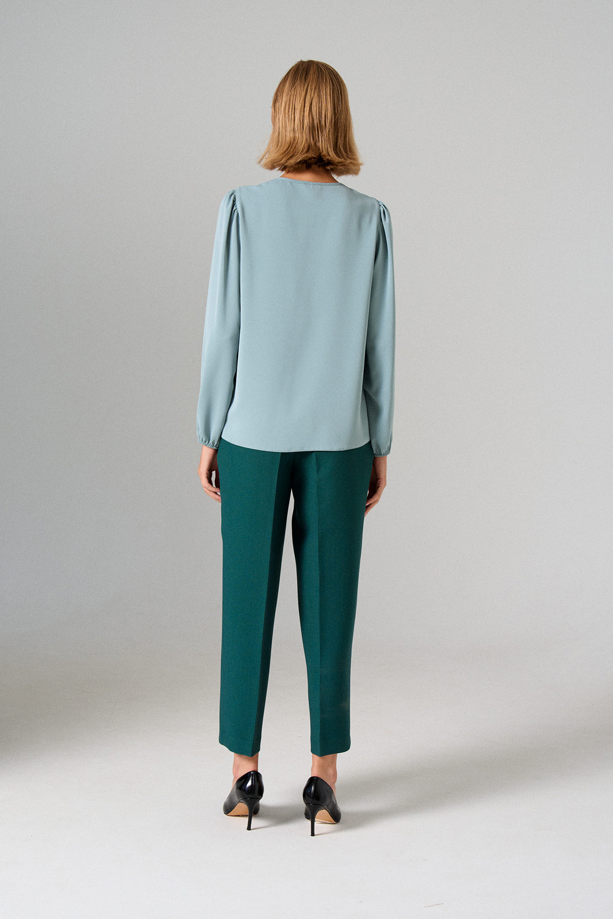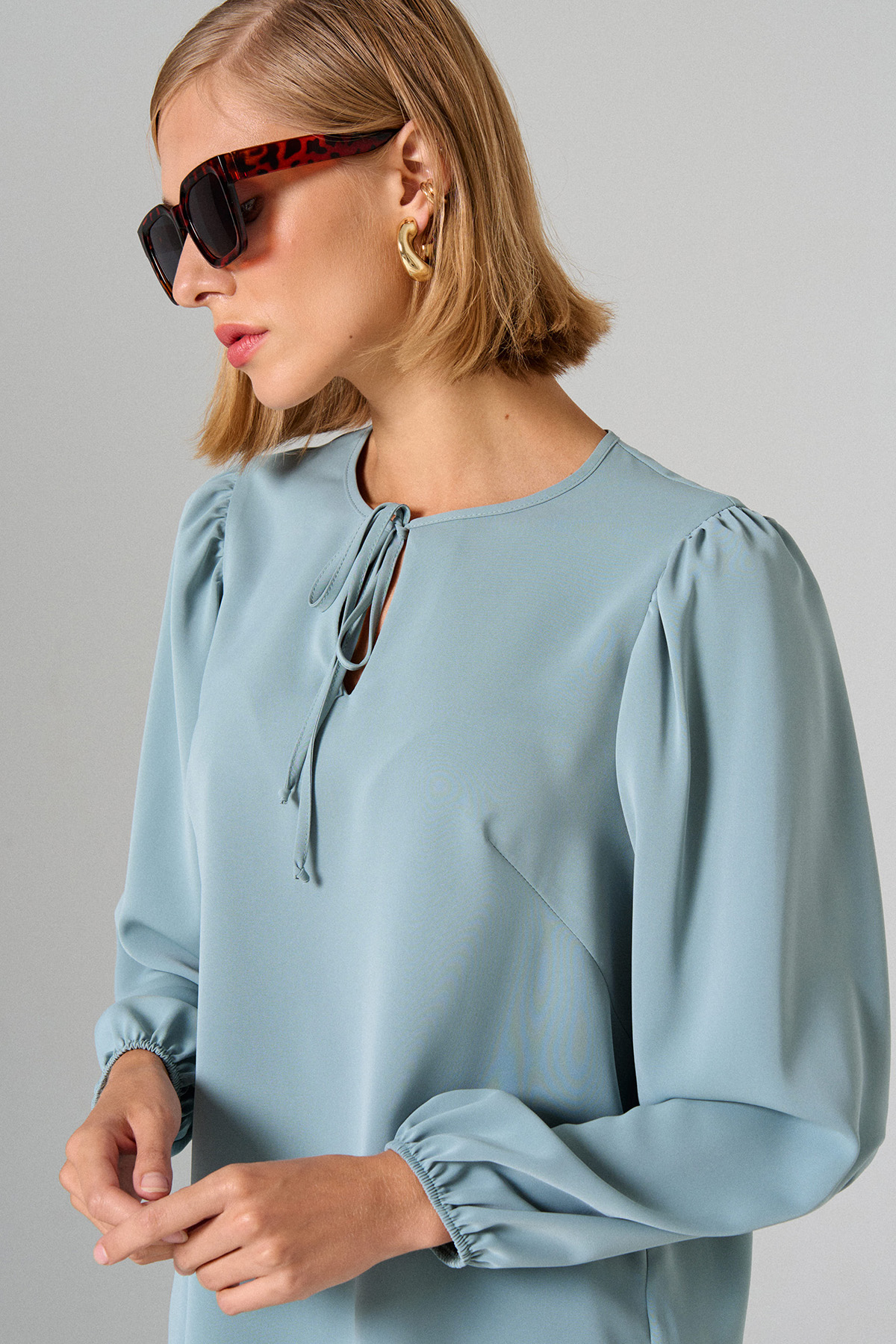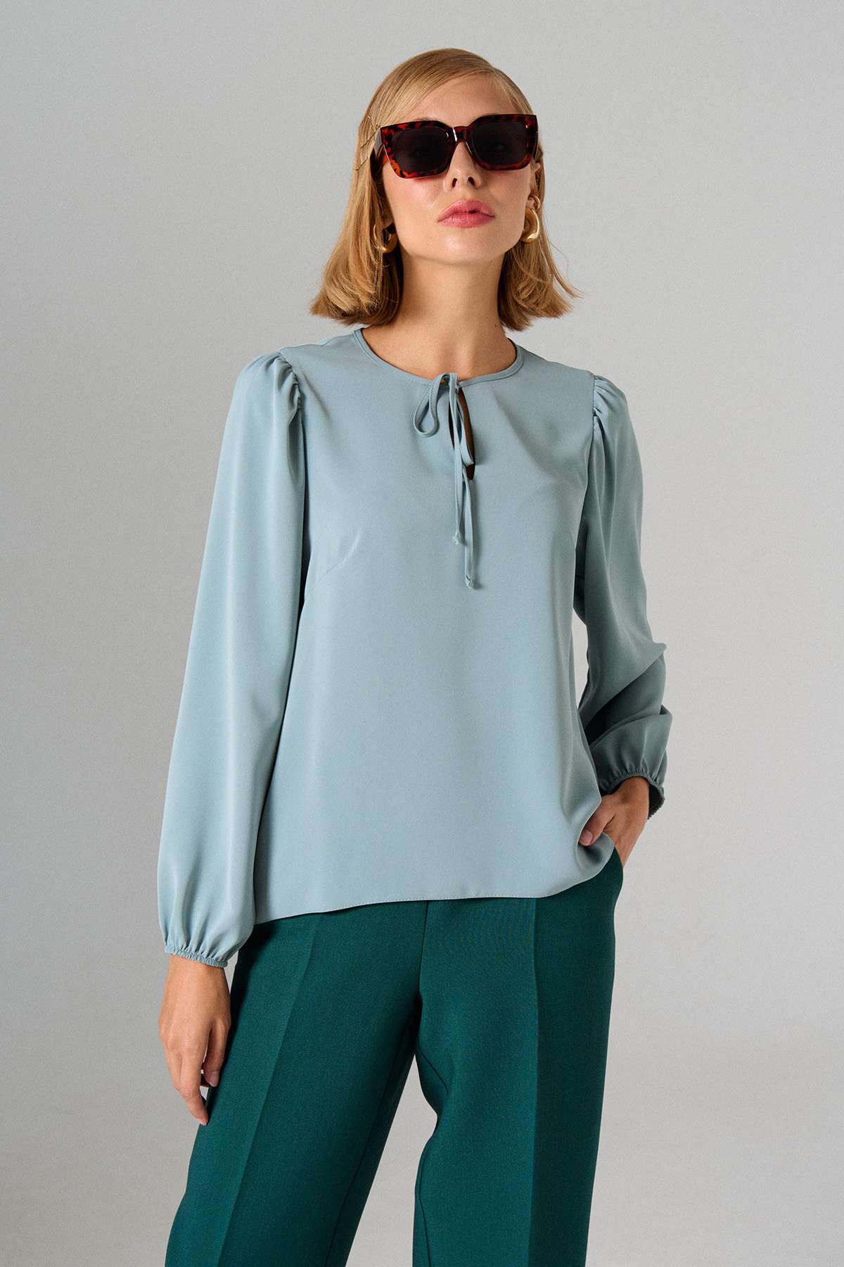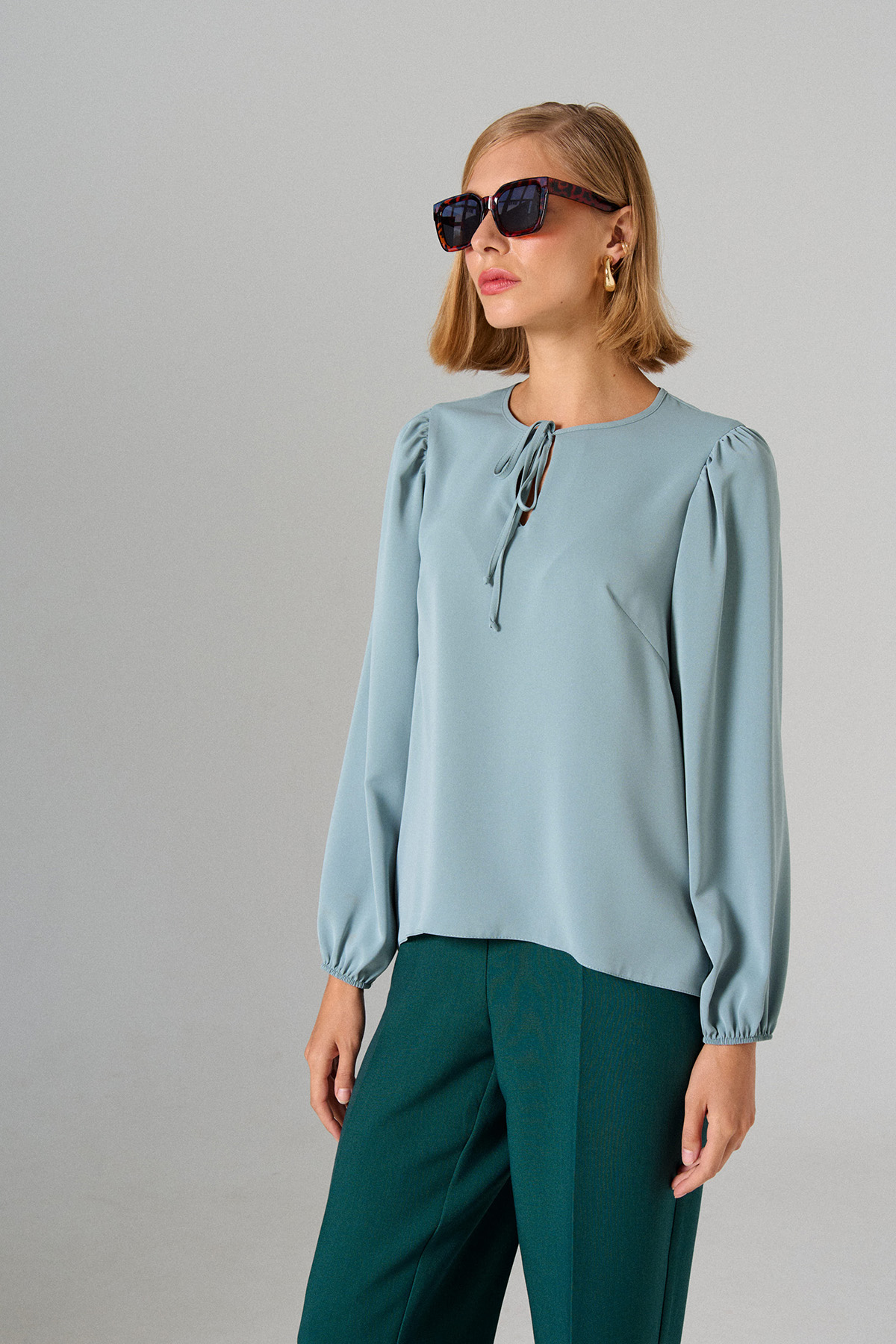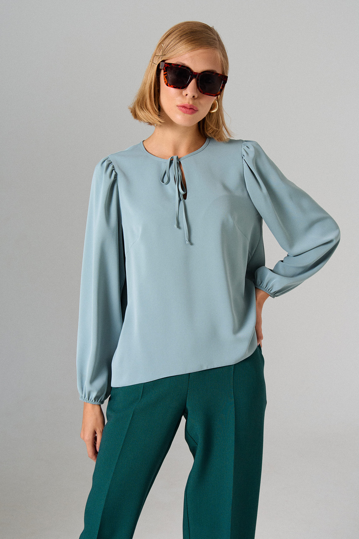 Свободного кроя со сборкой по линии втачивания рукава и укороченной длиной плеча, обеспечивающей красивую посадку на руке любой полноты.