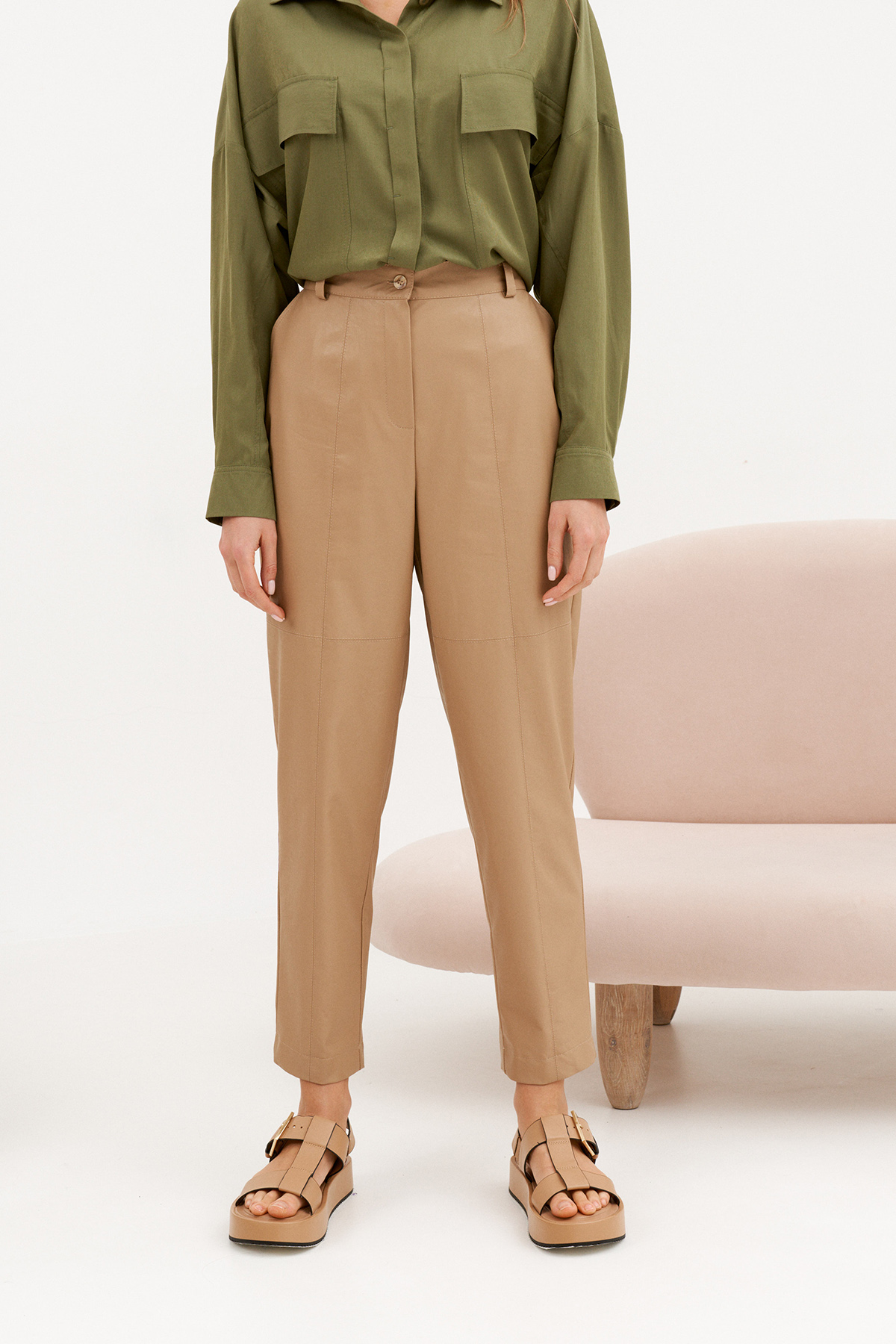Брюки с высокой талией, на поясе. По переду наклонные карманы. Выполнены из эко кожи на хлопковой основе. Изделие на притачном поясе. Брючины, зауженные книзу. Передние и задние полотнища из нескольких частей. Застежка с гульфиком и откоском, на притачной тесьме- молнии.