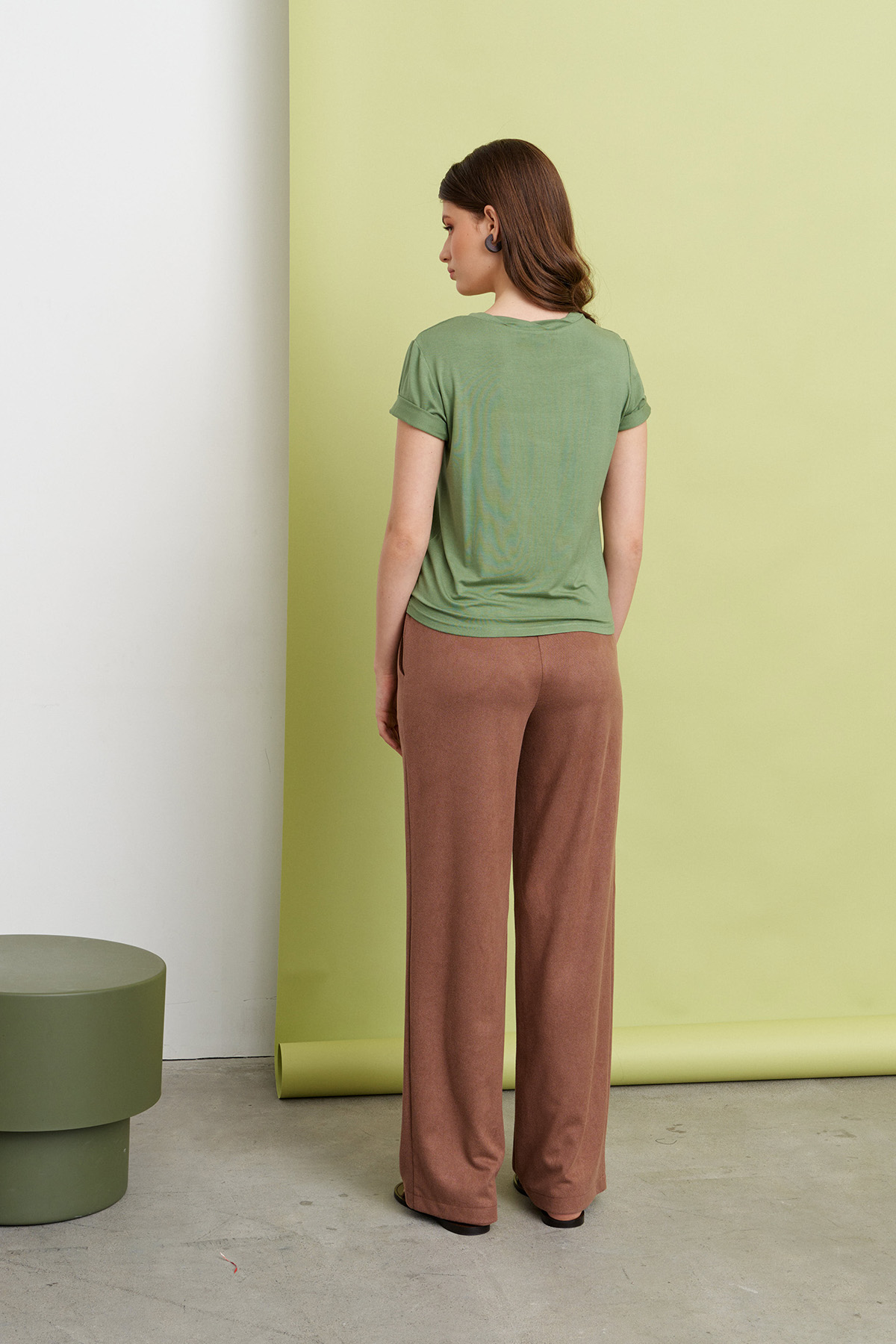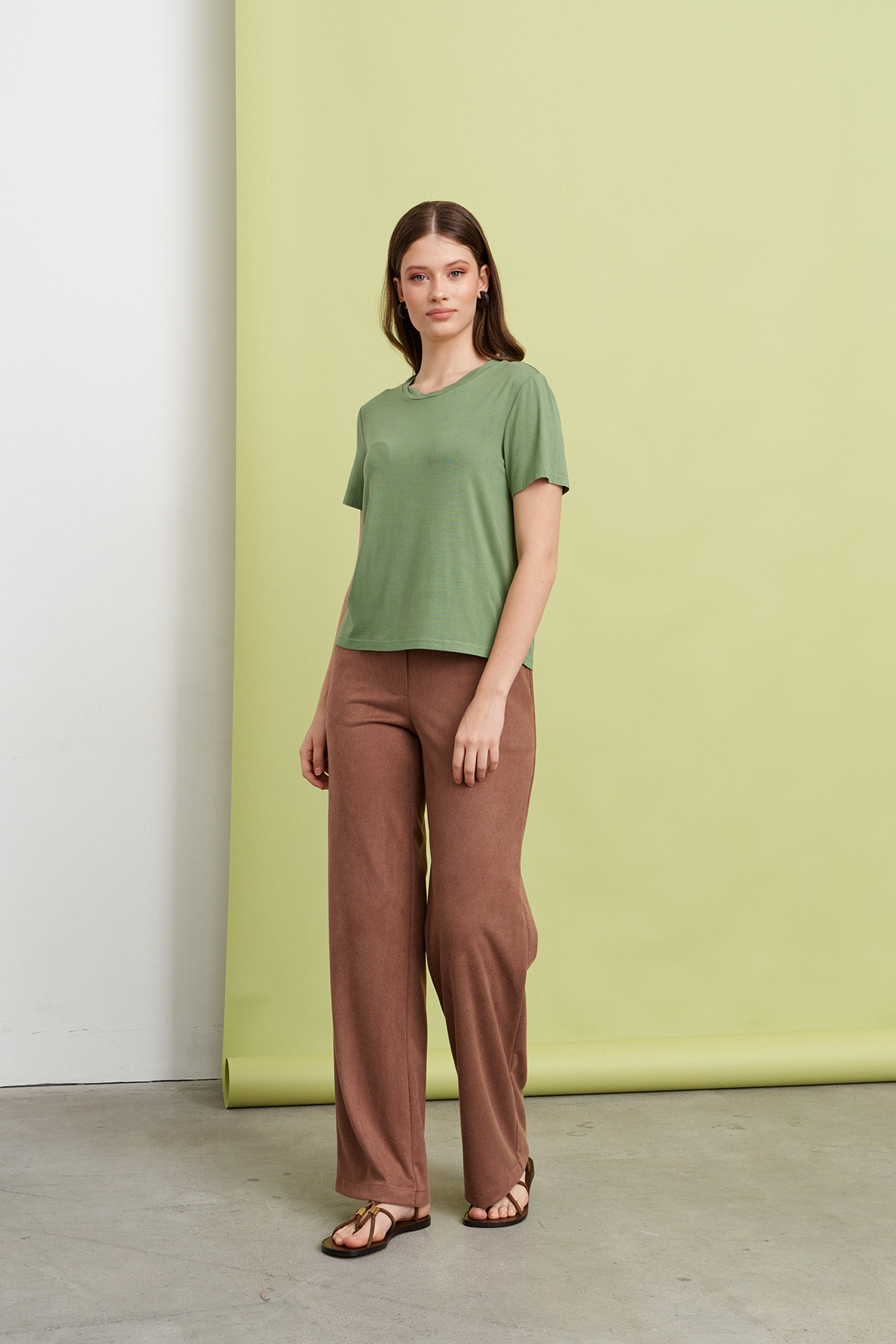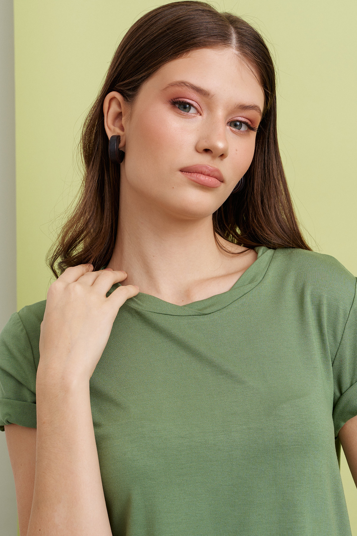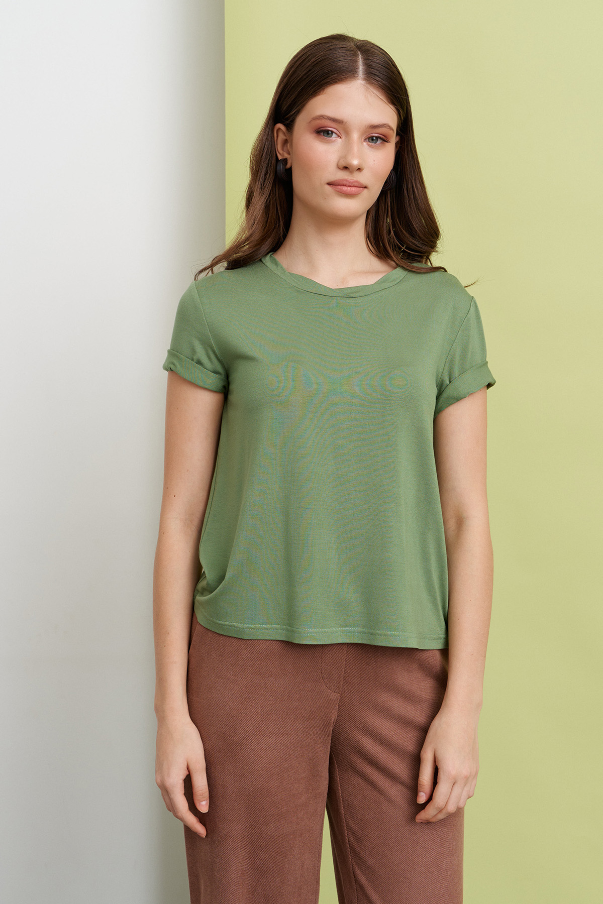 Футболка женская, полуприлегающая. Горловина округлой формы, с притачной перевернутой планкой. Рукав втачной короткий. Изделие выпускается в разных расцветках.