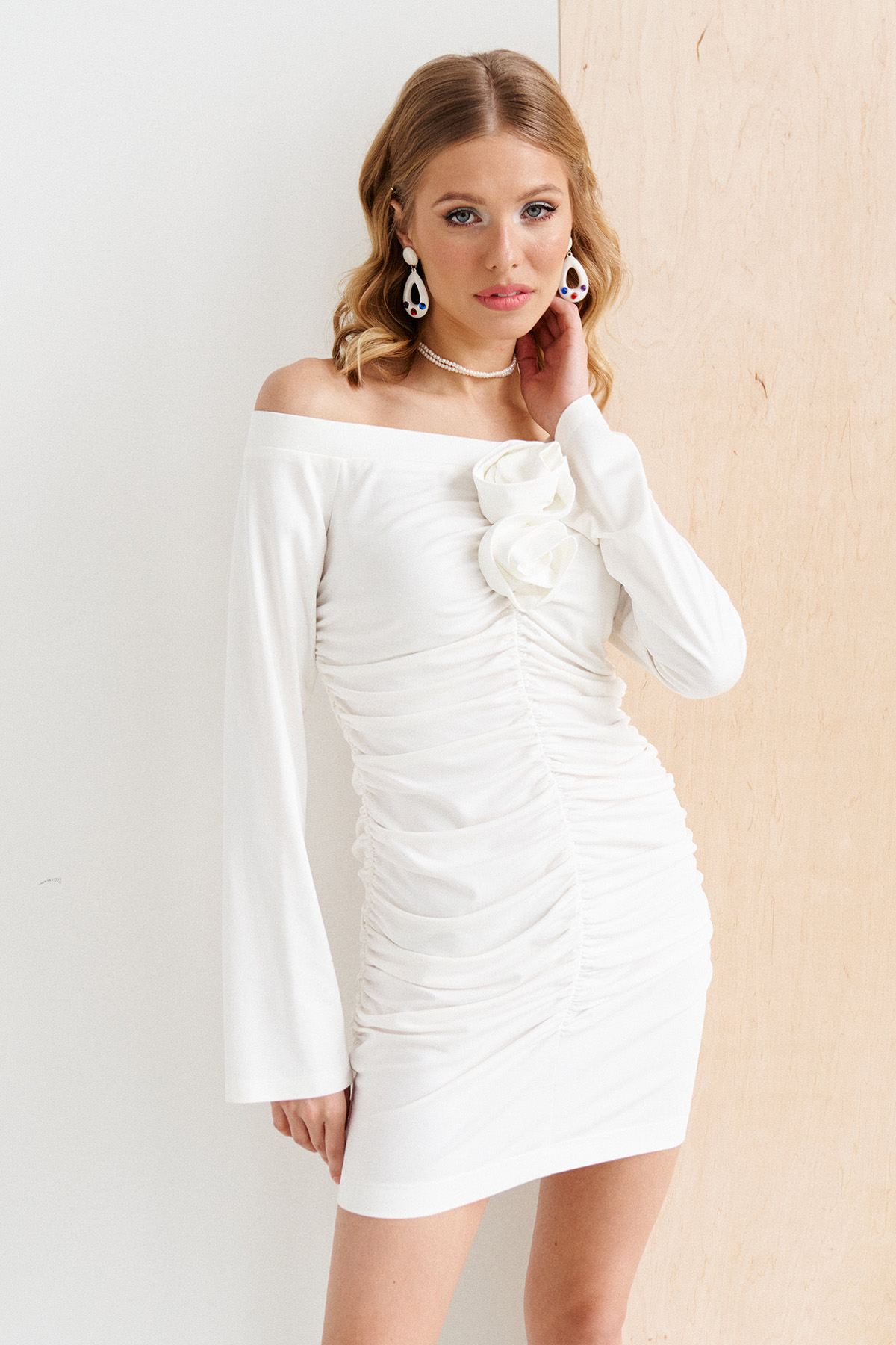 Платье женское, прилегающее. Выполнено из трикотажного полотна. Горловина округлой формы. Рукав длинный, расширенный к низу. Платье на голые плечи, с планкой. Перед из двух половинок, с сборкой. Так же сборка расположена по боковому шву. Изделие с декоративным украшением из основного материала-роза.