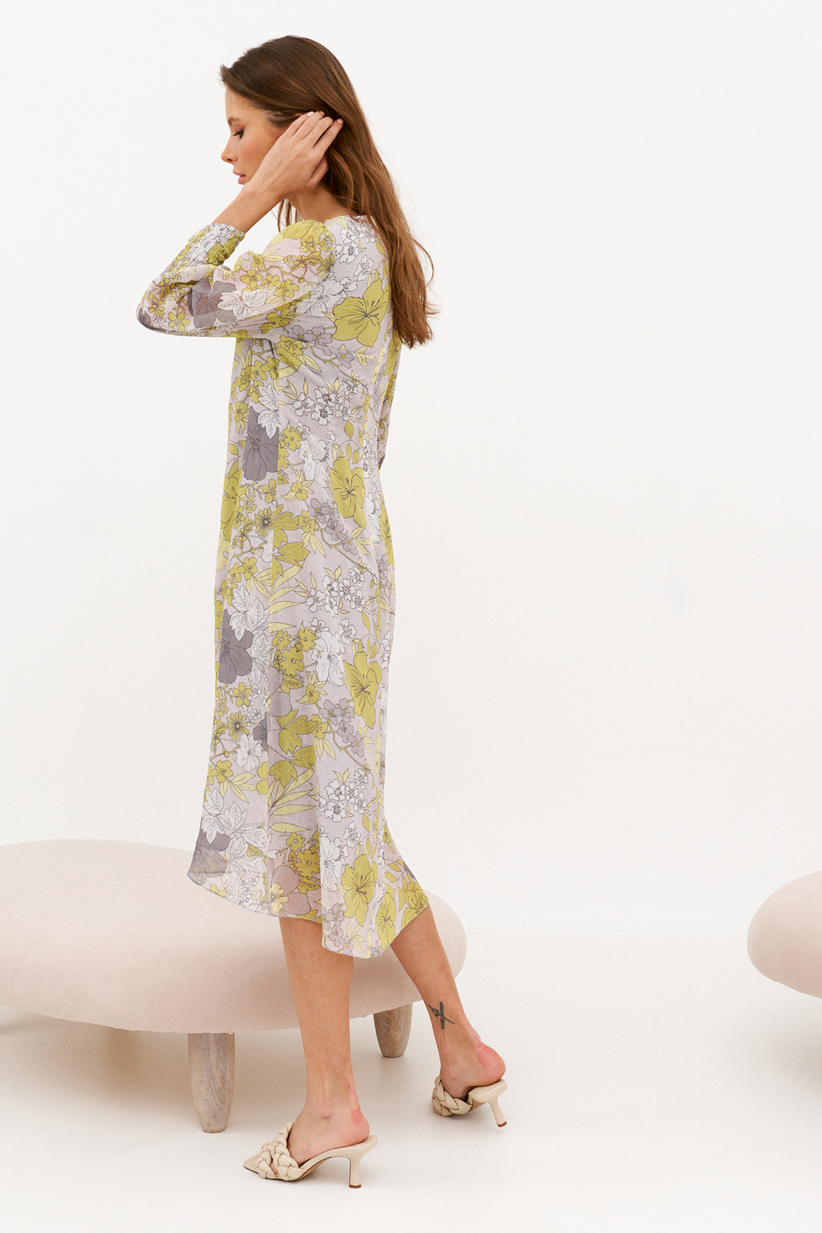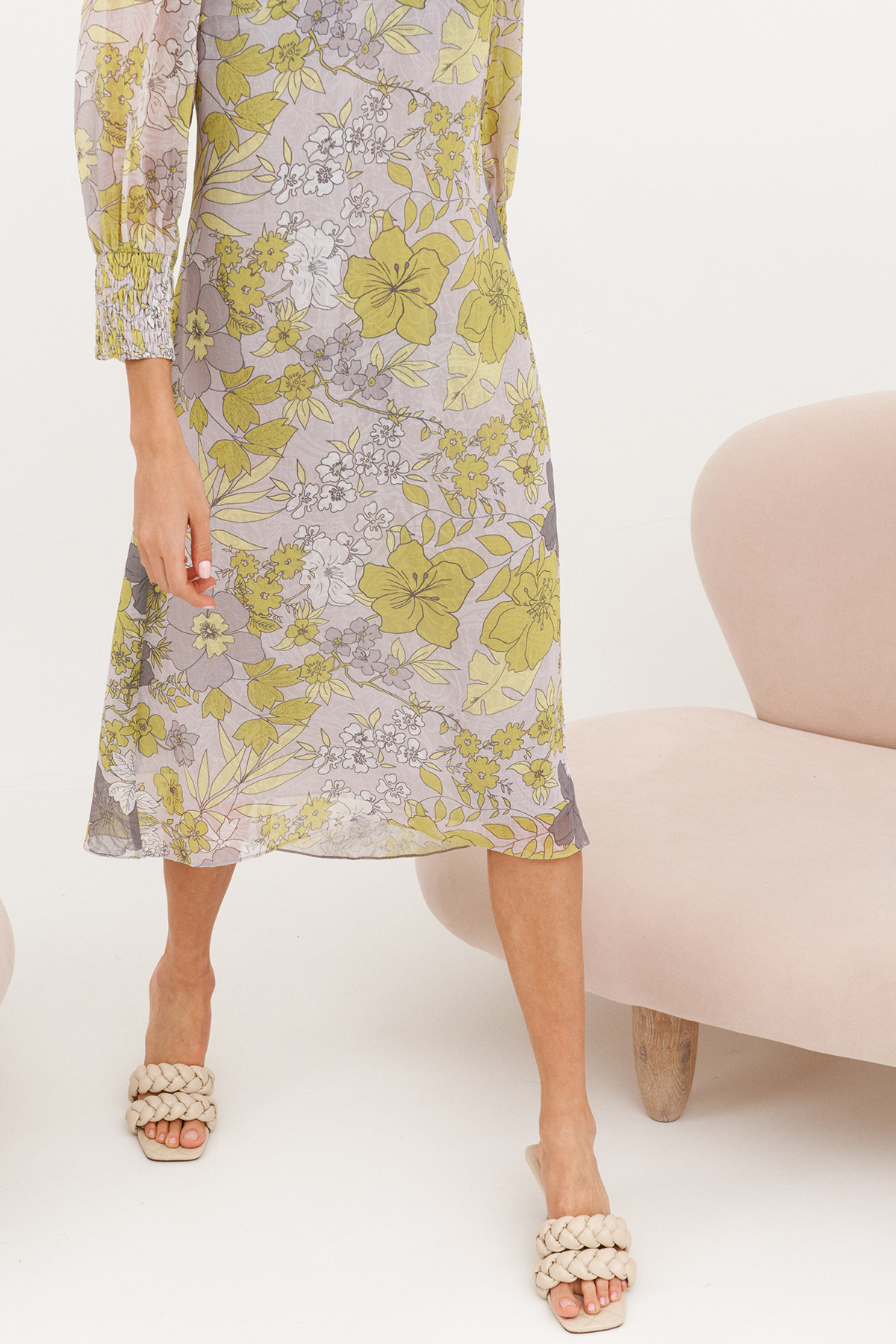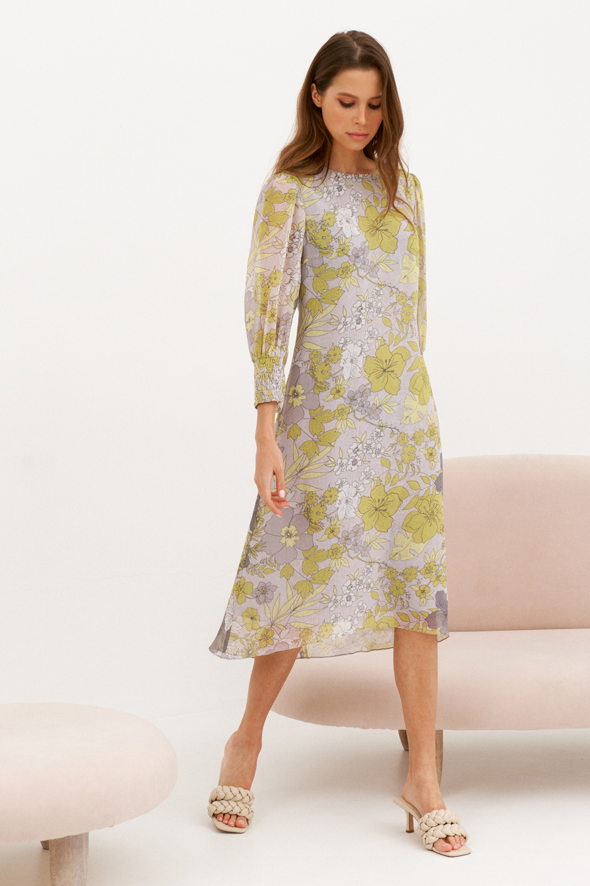 Легкое удобное платье свободного кроя, ткань креп-шифон, не мнется. Изделие на подкладке. Рукав втачной,с сборкой по окату. Состоит из 2х частей. Верхняя часть рукава по низу собрана на эластичную нить. По переду расположены нагрудные вытачки. Спинка платья со средним швом, сверху застежка на потайную молнию.